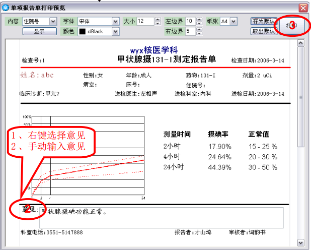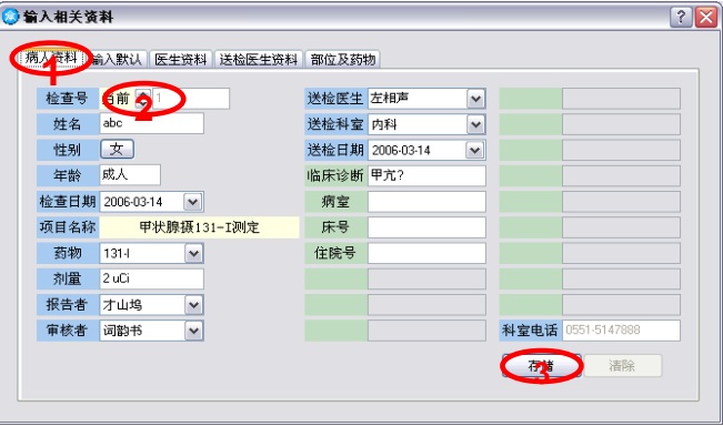 探測器:φ40mm×30mm碘化鈉探測器; 能量分辨率:≤7.5%; 本底計數(shù)率:≤900cpm; 點源靈敏度:≥0.14Bq/min; 兩檔增益控制:I-131、Tc-99m 配備準(zhǔn)直器; 配備甲狀腺標(biāo)尺; 軟件功能: 甲狀腺動態(tài)攝碘測量功能; 甲狀腺過氯酸鉀釋放測量功能; 甲狀腺激素抑制試驗; 甲狀腺半衰期試驗; 圖1 病人信息錄入 圖2 甲狀腺攝碘功能檢查報告