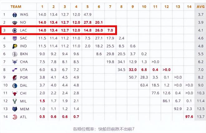 今天NBA迎來一場焦點對決,洛杉磯快船隊客場113-115惜敗火箭隊,此役過后快船戰績跌至6勝19負排在西部倒數第二,全聯盟排名倒數第三!熟悉NBA規則的小伙伴都應該明白,一支球隊的戰績將最終決定該球隊在下一個休賽期的選秀權位次。此役過后快船獲得下個休賽期狀元簽概率達到了14%,與奇才、鵜鶘并列聯盟第一,按照目前這種局面快船最差簽位都跌不出聯盟前7!