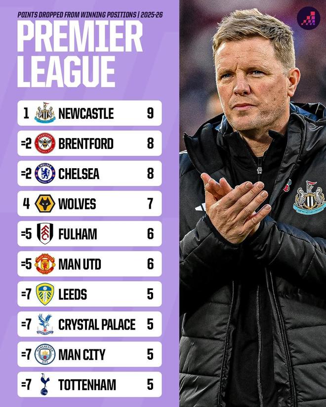 上一輪紐卡在客場被布倫特福德逆轉,據知名數據機構Opta統計,紐卡是本賽季英超領先之后丟分最多的球隊,丟掉多達9分,布倫特福德、切爾西并列次席。