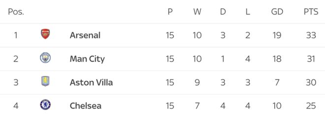 在薩利巴受傷之后,阿森納近三場聯賽僅取得一勝一平一負的成績。負于維拉之后,阿森納15輪之后繼續以33分領跑,維拉則以30分反超曼城,暫時排名第二位。