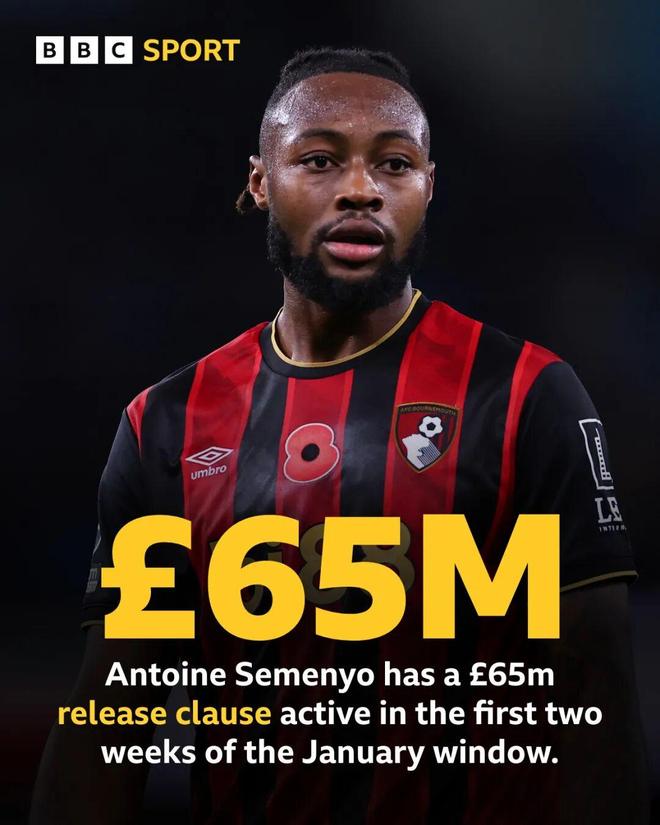 轉會記者羅馬諾表示,對所有密切關注塞梅尼奧的俱樂部而言,條款金額已非常明確:1月份為6000萬英鎊固定+500萬英鎊浮動,總計約6500萬英鎊;到了夏窗,金額會降到大約5000萬英鎊。接近伯恩茅斯的消息人士保證,俱樂部非常樂意先留人至賽季結束,7月再低價出售,讓塞梅尼奧繼續擔任主帥安多尼·伊勞拉的關鍵棋子。但主動權不在他們——只要條款被激活,去留完全由球員決定。